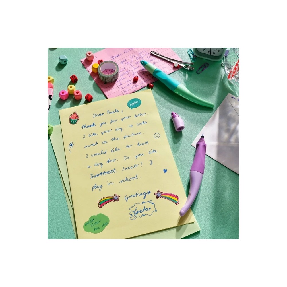 The STABILO EASYoriginal ergonomic rollerball pen is now also available in soft and subtle pastel colors. Right-handed writers can choose between cloudy blue, pink blush, lilac haze and hint of mint and left-handed writers between cloudy blue, pink blush and hint of mint. With its non-slip grip zone, the rollerball pen sits comfortably in the hand. Easy handling means hands remain eager to write. Blots and scratches are a thing of the past – learner writers now benefit from easy handling. That means endless fun with the pen and neat and tidy handwriting. Each cartridge has a new tip so you can switch refills quickly and cleanly, and carry on writing. Refills are available in “fine” (erasable blue, 0.3 mm for fine writing) and “medium” (erasable blue, black, red, 0.5 mm). With so much going for it, the thing to do first is put a name in the practical name space.