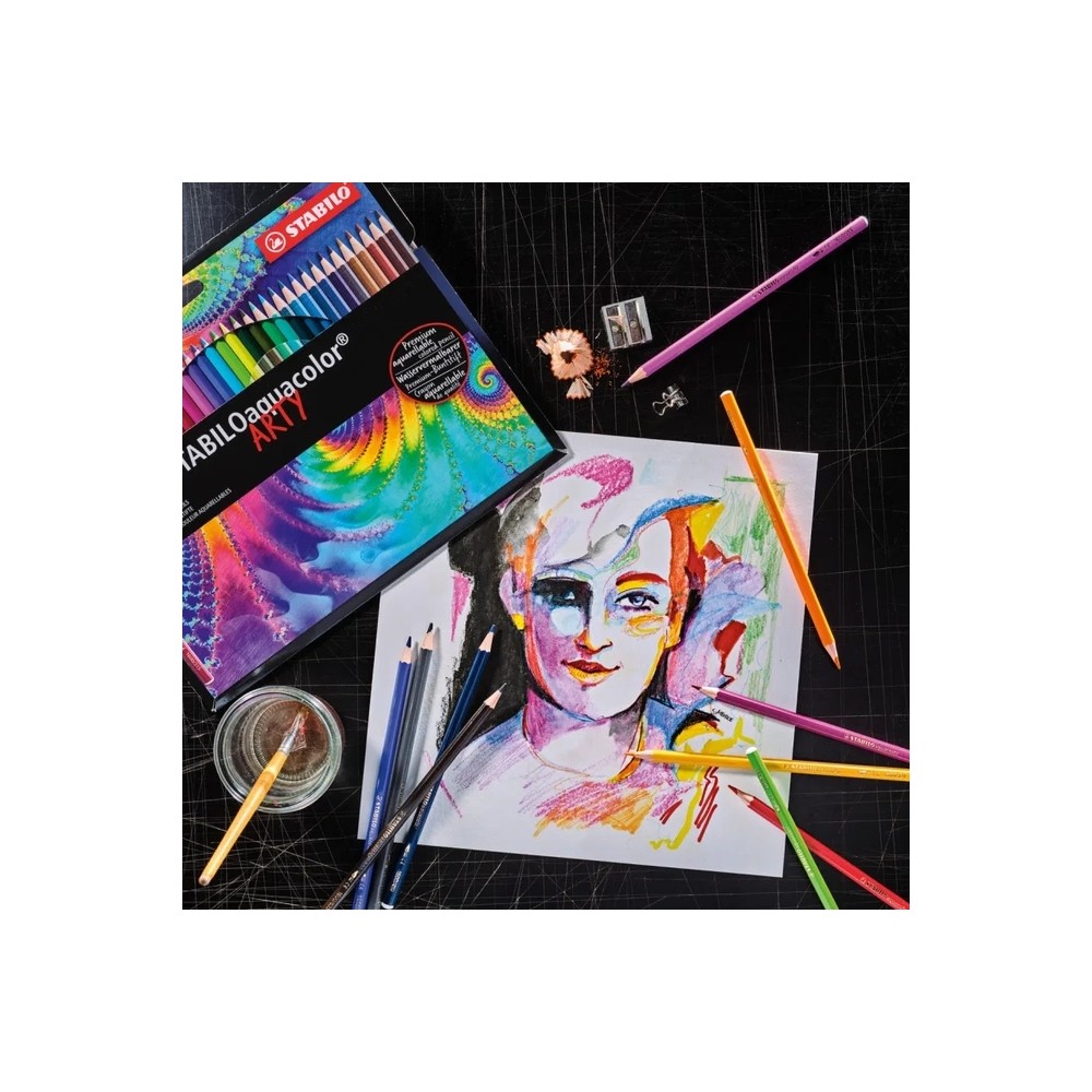 The aquarellable color pencil STABILOaquacolor in a cardboard wallet "ARTY" with 36 brilliant colors. You can find a list of color names and color numbers under Properties.